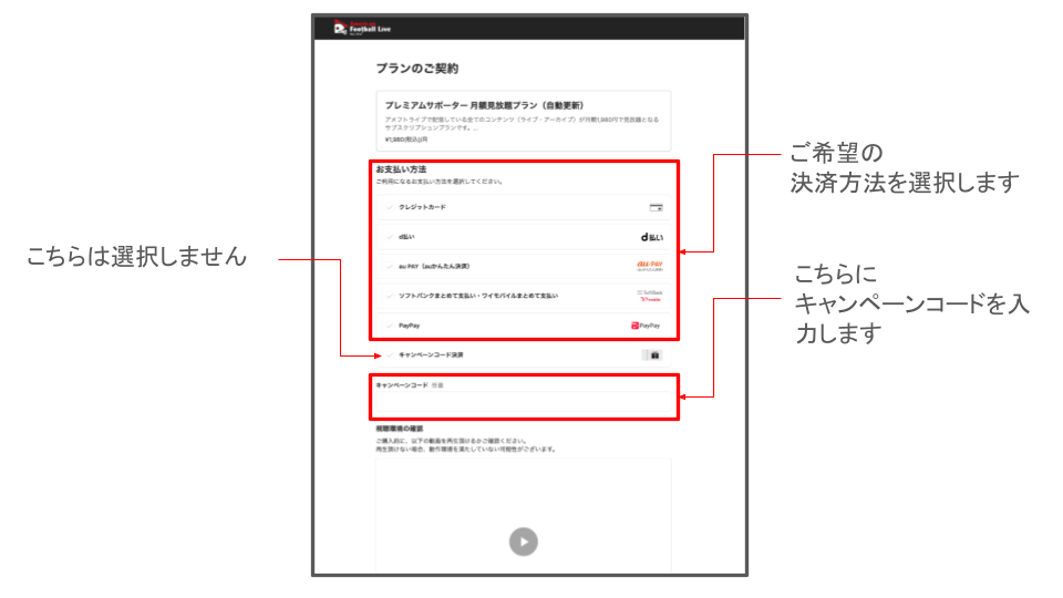 ※「プレミアムサポーター 月額見放題プラン(自動更新)」に関するキャンペーンのご使用の際は「キャンペーンコード決済」は選択せず、「キャンペーンコード決済」以外の決済方法をご選択ください。